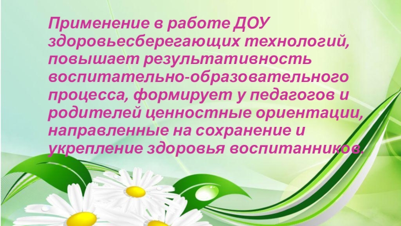 Слайд 21Применение в работе ДОУ здоровьесберегающих технологий, повышает результативность воспитательно-образовательного процесса, формирует у педагогов и родителей ценностные