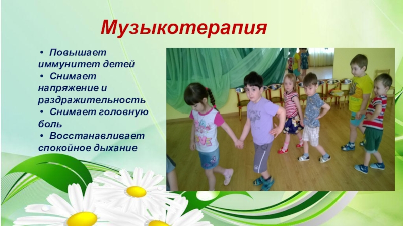 МузыкотерапияПовышаетиммунитет детейСнимаетнапряжение ираздражительностьСнимает головнуюбольВосстанавливаетспокойное дыхание
