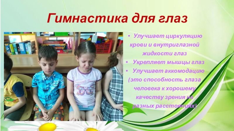 Гимнастика для глазУлучшает циркуляциюкрови и внутриглазнойжидкости глаз Укрепляет мышцы глаз Улучшает аккомодацию(это способность глазачеловека к хорошемукачеству зрения