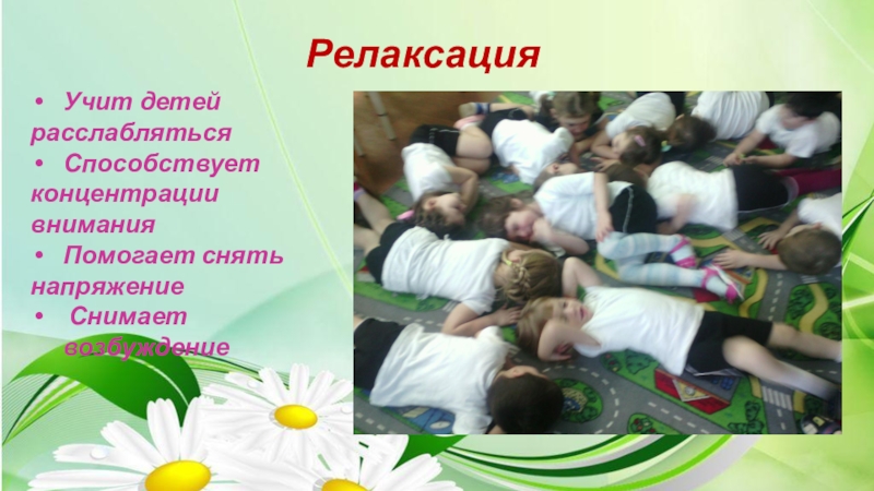 РелаксацияУчит детейрасслаблятьсяСпособствуетконцентрациивниманияПомогает снятьнапряжение Снимает возбуждение