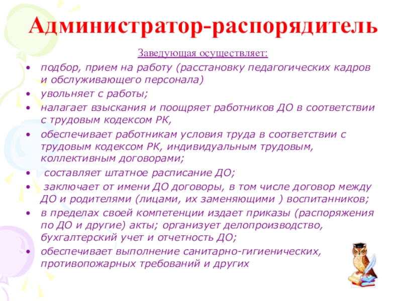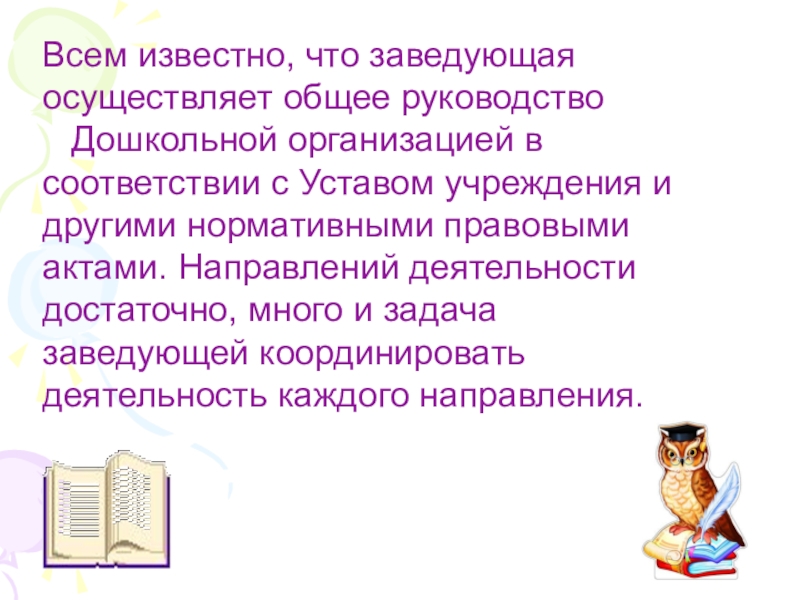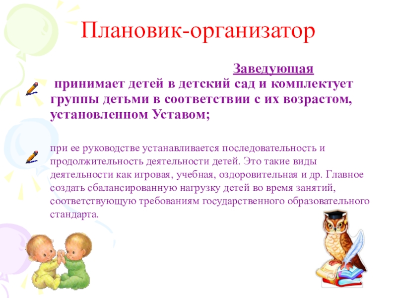 при ее руководстве устанавливается последовательность и продолжительность деятельности детей. Это такие виды деятельности как игровая, учебная, оздоровительная и др. Главное создать сбалансированную нагрузку детей во время занятий, соответствующую требованиям государственного образовательного стандарта.