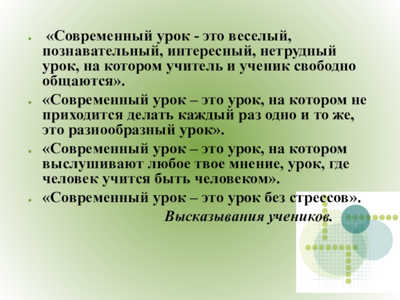 «Современный урок – это урок, на котором выслушивают любое твое мнение, урок, где человек учится быть человеком».