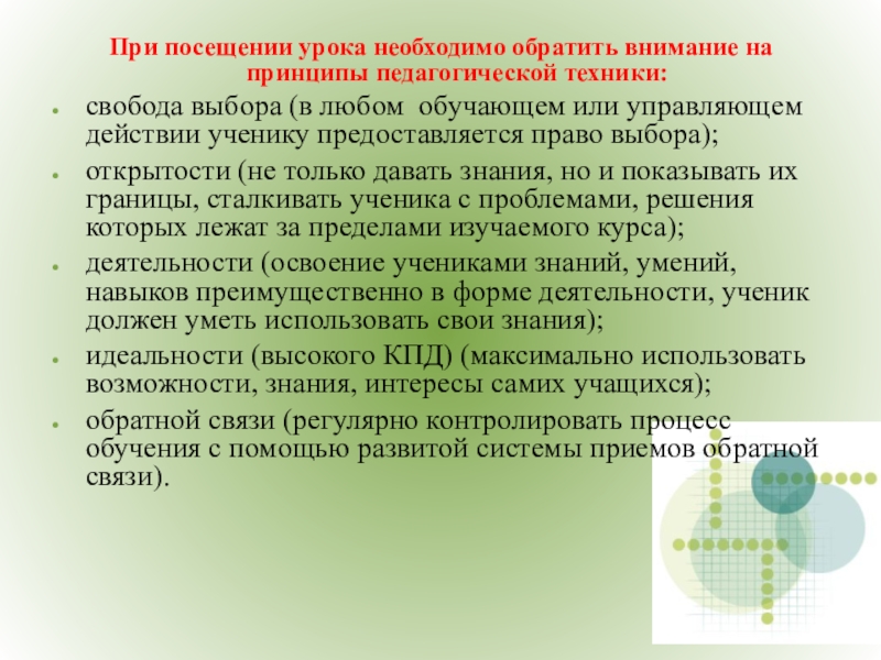 Слайд 13При посещении урока необходимо обратить внимание на принципы педагогической техники: