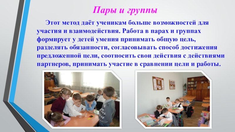 взаимодействия. Работа в парах и группах формирует у детей умения принимать общую цель, разделять обязанности, согласовывать способ достижения предложенной цели, соотносить свои действия с действиями партнеров, принимать участие в сравнении цели и работы.