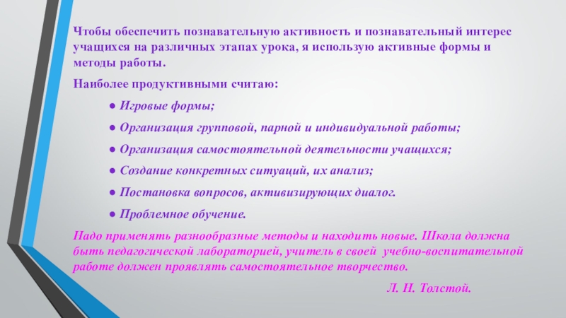 Надо применять разнообразные методы и находить новые. Школа должна быть педагогической лабораторией, учитель в своей учебно-воспитательной работе должен проявлять самостоятельное творчество.