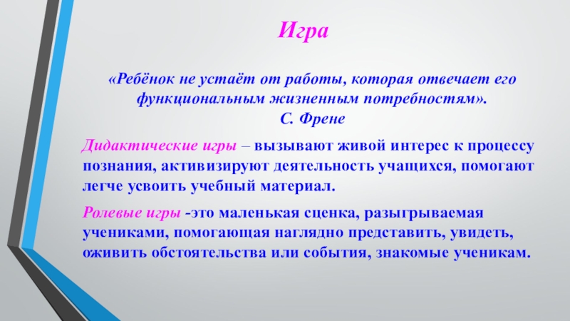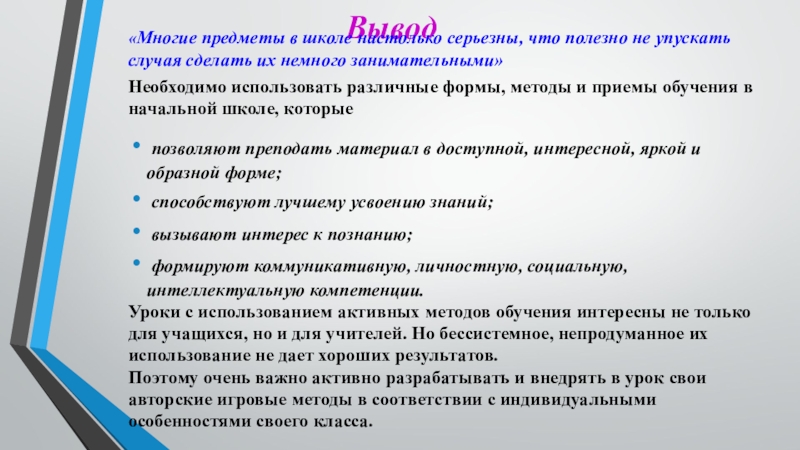 Поэтому очень важно активно разрабатывать и внедрять в урок свои авторские игровые методы в соответствии с индивидуальными особенностями своего класса.