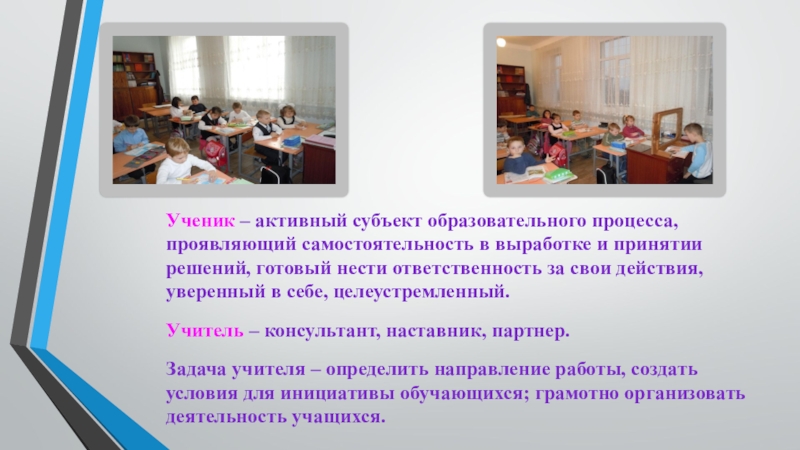 Слайд 5Ученик – активный субъект образовательного процесса, проявляющий самостоятельность в выработке и