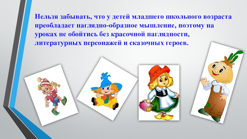 Слайд 15Нельзя забывать, что у детей младшего школьного возраста преобладает наглядно-образное мышление,