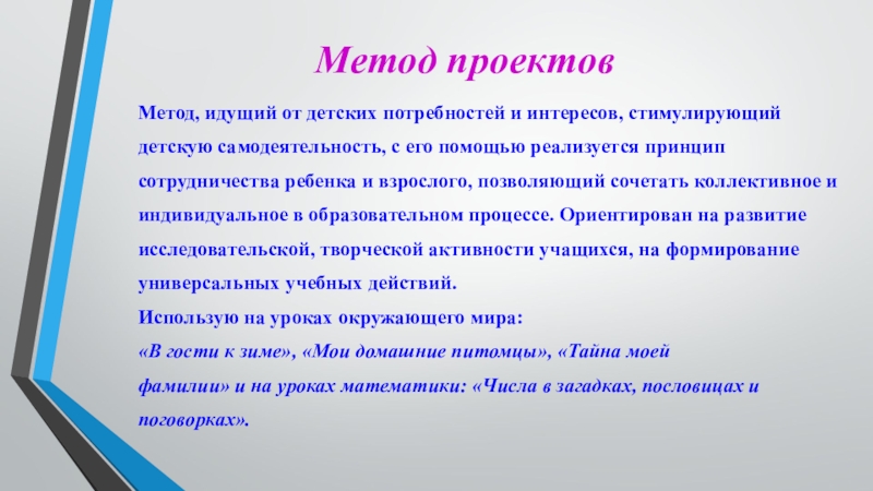 с его помощью реализуется принцип сотрудничества ребенка и взрослого, позволяющий сочетать коллективное и индивидуальное в образовательном процессе. Ориентирован на развитие исследовательской, творческой активности учащихся, на формирование универсальных учебных действий.