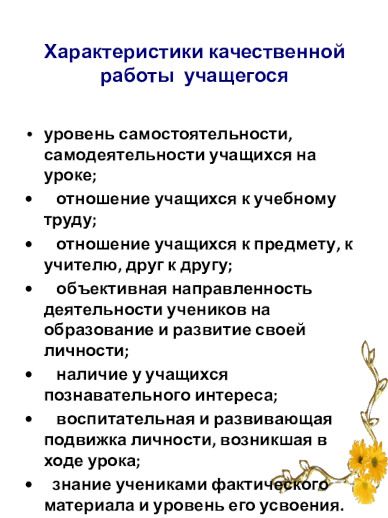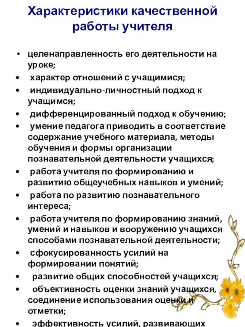 Слайд 8Характеристики качественной работы учителя