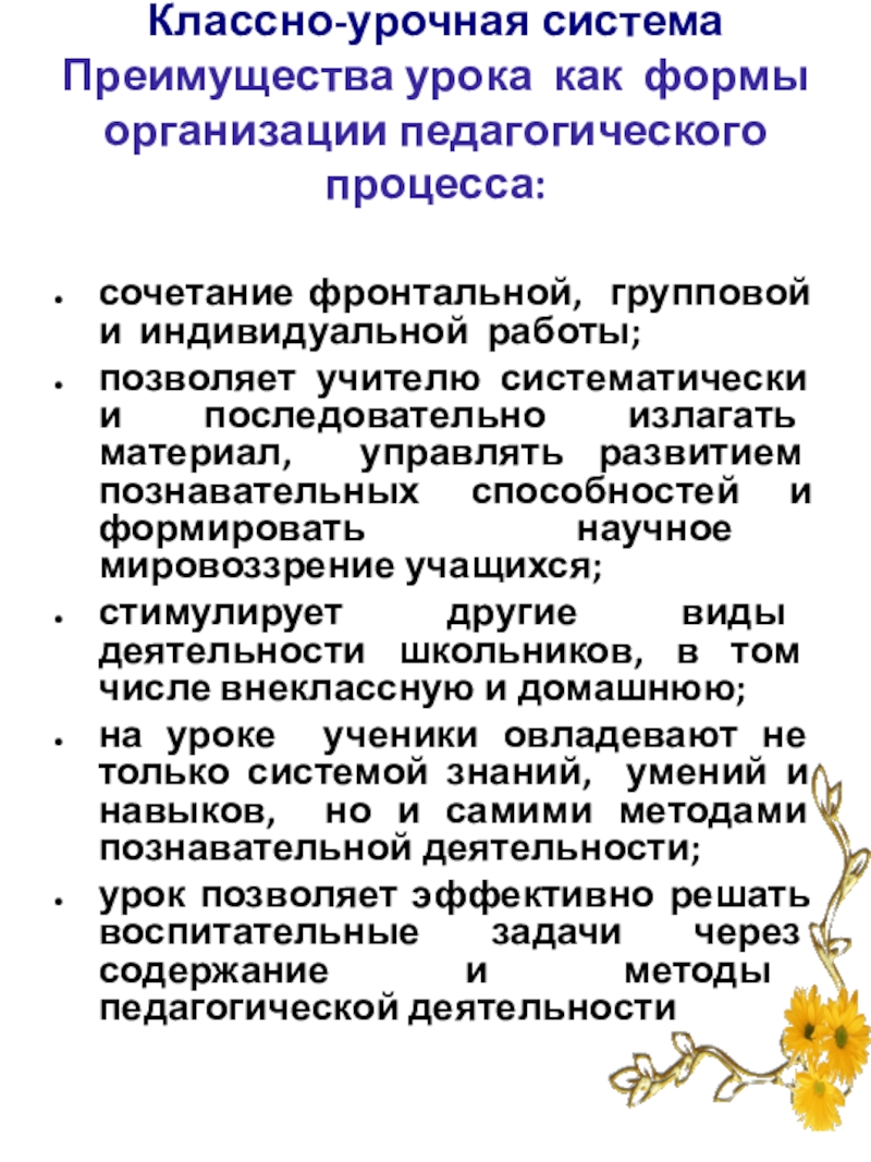 Преимущества урока как формы организации педагогического процесса: