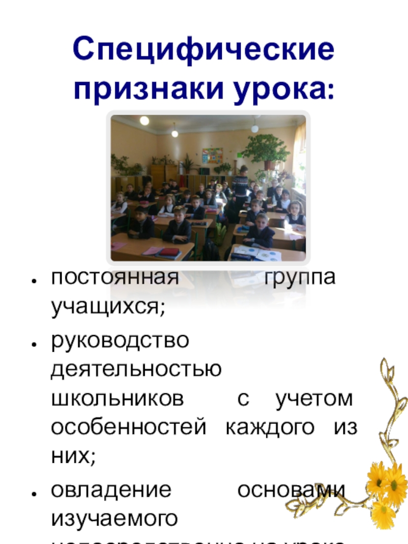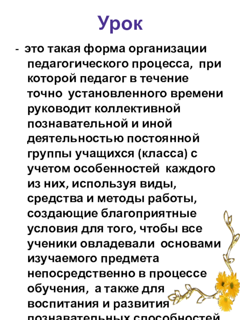течение точно установленного времени руководит коллективной познавательной и иной деятельностью постоянной группы учащихся (класса) с учетом особенностей каждого из них, используя виды, средства и методы работы, создающие благоприятные условия для того, чтобы все ученики овладевали основами изучаемого предмета непосредственно в процессе обучения, а также для воспитания и развития познавательных способностей и духовных сил школьников