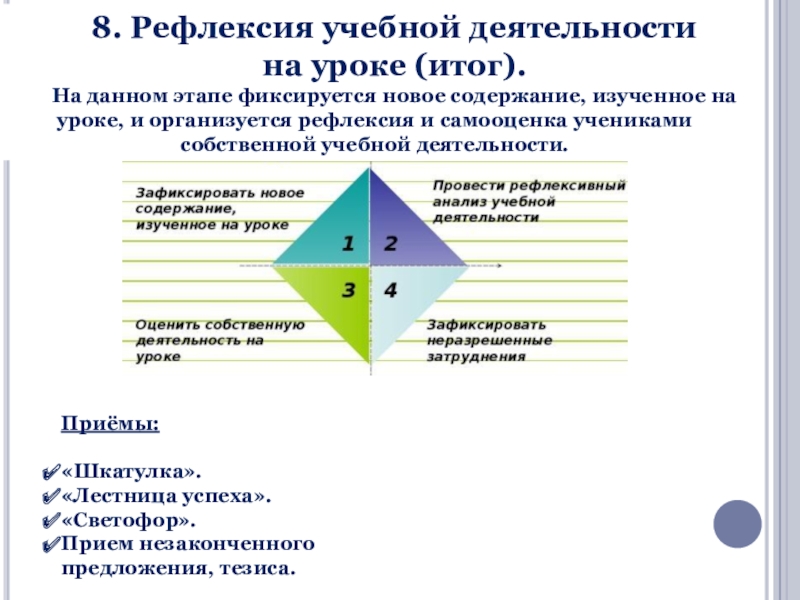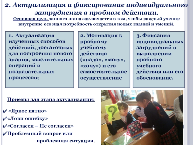 1. Актуализация изученных способов действий, достаточных для построения нового знания, мыслительных операций и познавательных процессов;