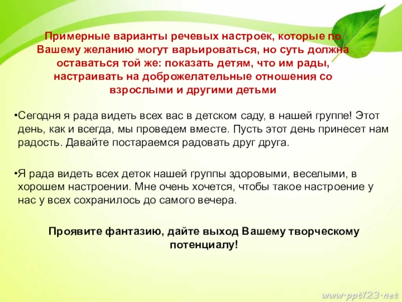 Сегодня я рада видеть всех вас в детском саду, в нашей группе! Этот день, как и всегда, мы проведем вместе. Пусть этот день принесет нам радость. Давайте постараемся радовать друг друга.