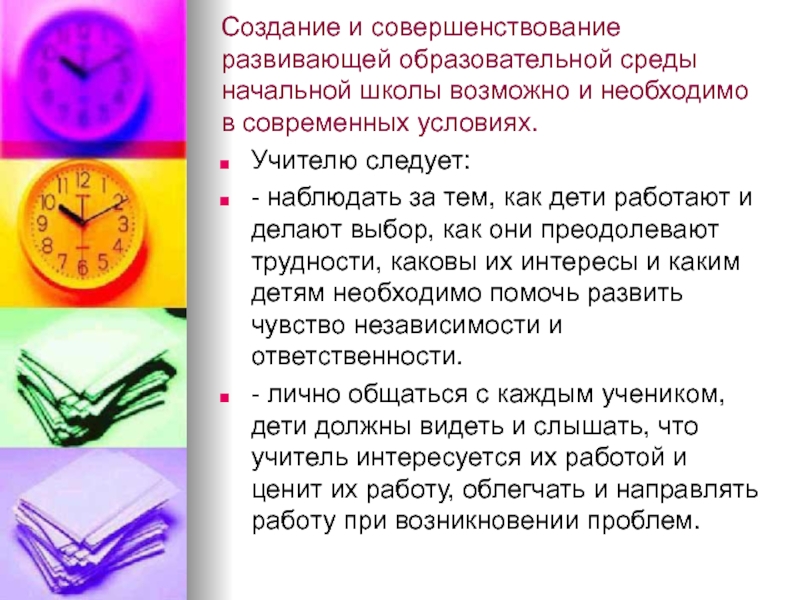 - лично общаться с каждым учеником, дети должны видеть и слышать, что учитель интересуется их работой и ценит их работу, облегчать и направлять работу при возникновении проблем.