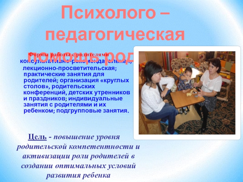 Цель - повышение уровня родительской компетентности и активизации роли родителей в создании оптимальных условий развития ребенка