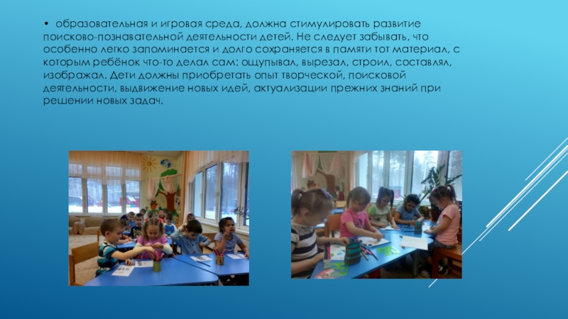 • образовательная и игровая среда, должна стимулировать развитие поисково-познавательной деятельности