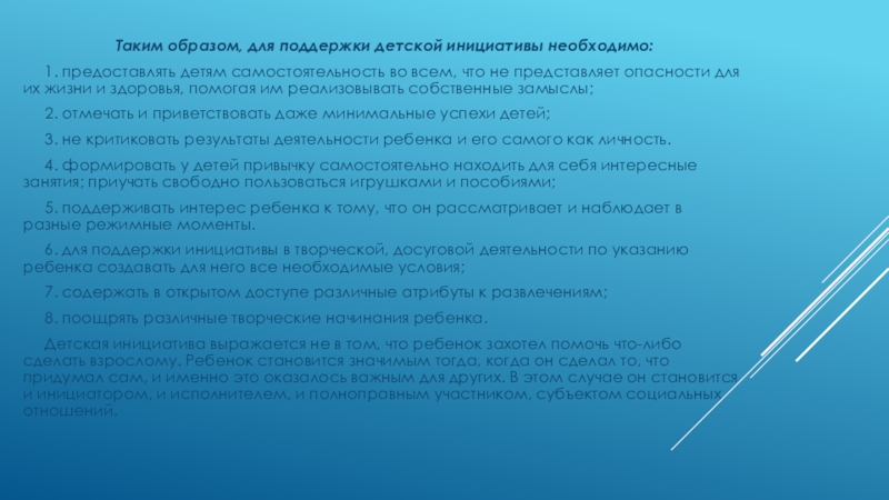 Детская инициатива выражается не в том, что ребенок захотел помочь что-либо сделать взрослому. Ребенок становится значимым тогда, когда он сделал то, что придумал сам, и именно это оказалось важным для других. В этом случае он становится и инициатором, и исполнителем, и полноправным участником, субъектом социальных отношений.
