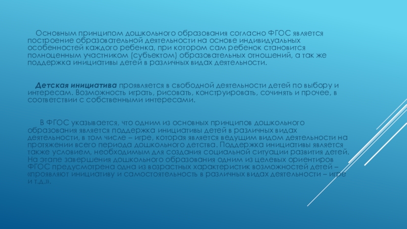 Слайд 2 Основным принципом дошкольного образования согласно ФГОС является