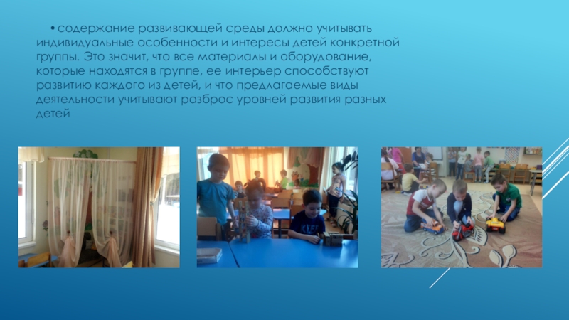 Слайд 5 • содержание развивающей среды должно учитывать индивидуальные особенности и интересы