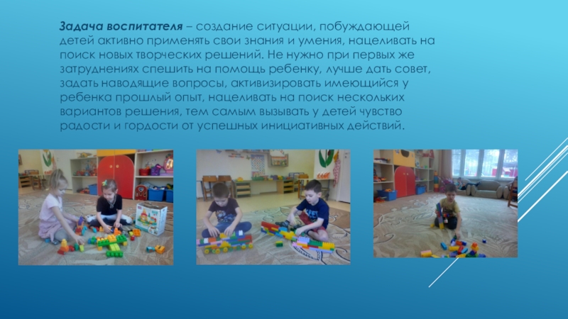 Слайд 6Задача воспитателя – создание ситуации, побуждающей детей активно применять свои знания