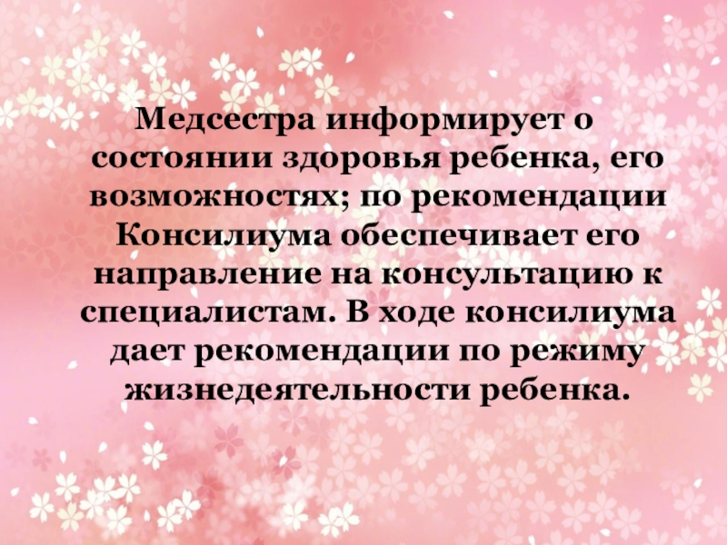 Слайд 15Медсестра информирует о состоянии здоровья ребенка, его возможностях; по рекомендации Консилиума