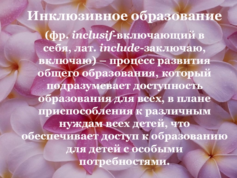 (фр. inclusif-включающий в себя, лат. include-заключаю, включаю) – процесс развития общего образования, который