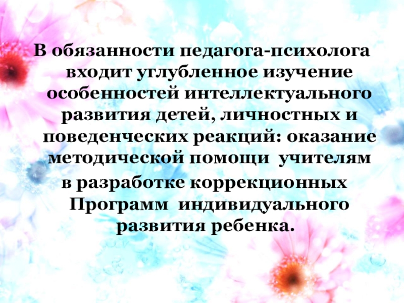 Слайд 12В обязанности педагога-психолога входит углубленное изучение особенностей интеллектуального развития детей, личностных