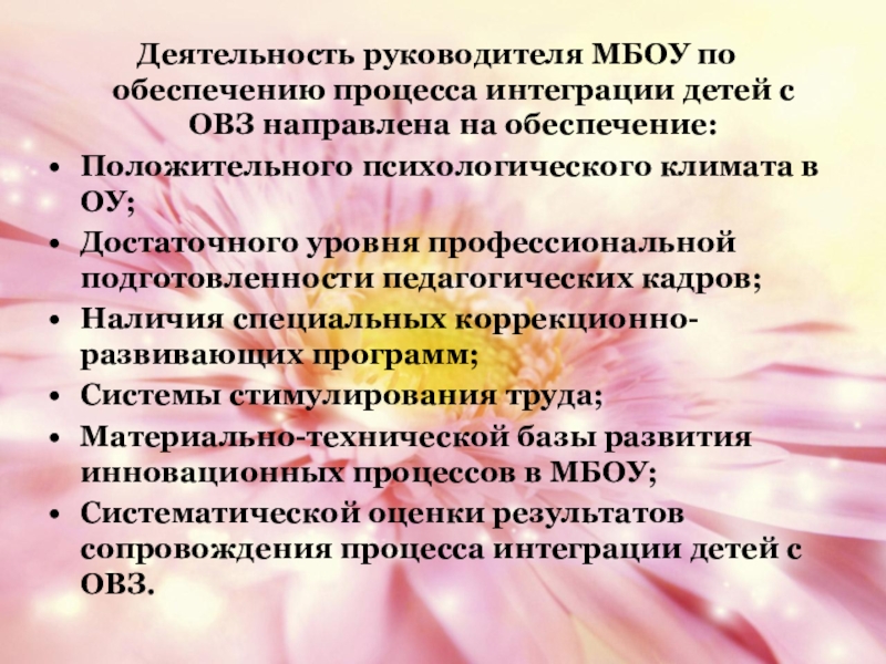 Слайд 19Деятельность руководителя МБОУ по обеспечению процесса интеграции детей с ОВЗ направлена
