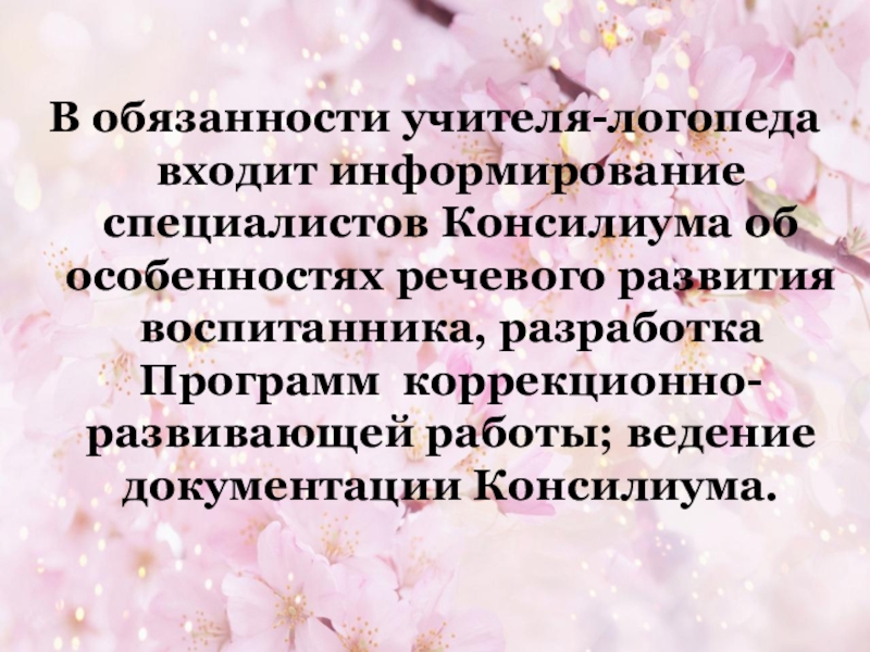 Слайд 11В обязанности учителя-логопеда входит информирование специалистов Консилиума об особенностях речевого развития