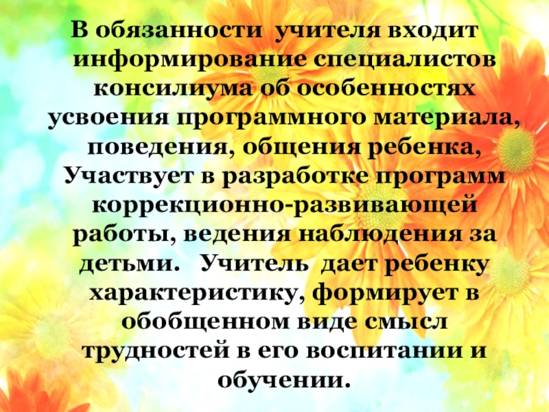 Слайд 13В обязанности учителя входит информирование специалистов консилиума об особенностях усвоения программного
