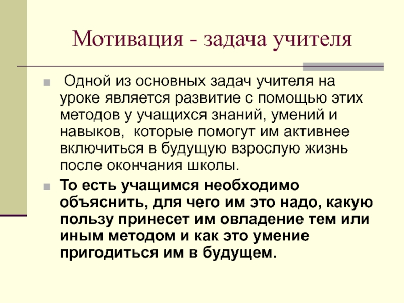 То есть учащимся необходимо объяснить, для чего им это надо, какую пользу принесет им овладение тем или иным методом и как это умение пригодиться им в будущем.