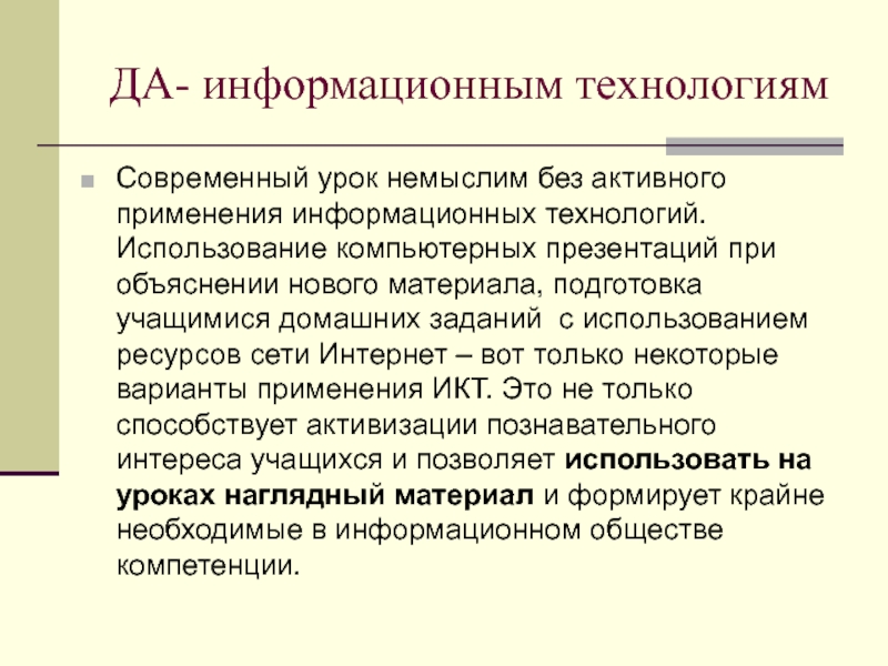 Использование компьютерных презентаций при объяснении нового материала, подготовка учащимися домашних заданий с использованием ресурсов сети Интернет – вот только некоторые варианты применения ИКТ. Это не только способствует активизации познавательного интереса учащихся и позволяет использовать на уроках наглядный материал и формирует крайне необходимые в информационном обществе компетенции.