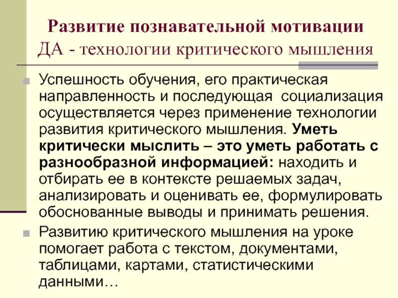 Развитию критического мышления на уроке помогает работа с текстом, документами, таблицами, картами, статистическими данными…
