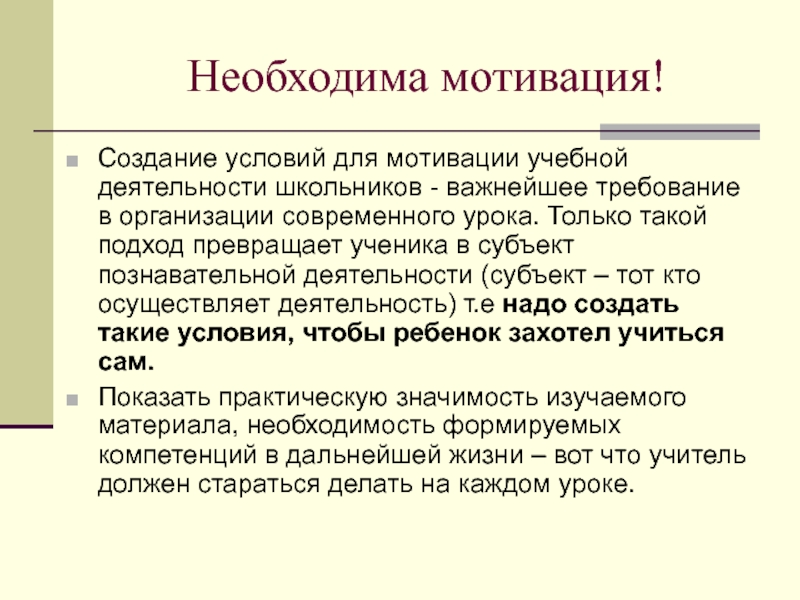 в организации современного урока. Только такой подход превращает ученика в субъект познавательной деятельности (субъект – тот кто осуществляет деятельность) т.е надо создать такие условия, чтобы ребенок захотел учиться сам.