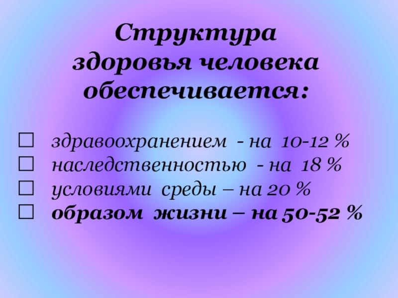 Здоровое питание, наследственность, экология полноценный сон, соблюдение режима дня, ЗОЖ, двигательная