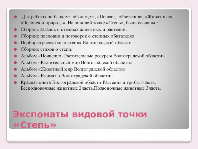 «Растения», «Животные», «Человек и природа». На видовой точке «Степь», были созданы :