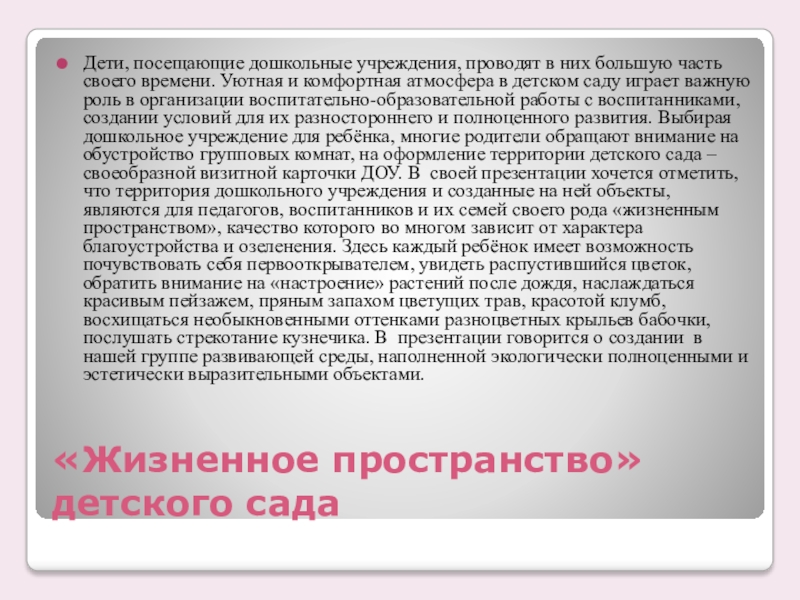 часть своего времени. Уютная и комфортная атмосфера в детском саду играет важную роль в организации воспитательно-образовательной работы с воспитанниками, создании условий для их разностороннего и полноценного развития. Выбирая дошкольное учреждение для ребёнка, многие родители обращают внимание на обустройство групповых комнат, на оформление территории детского сада – своеобразной визитной карточки ДОУ. В своей презентации хочется отметить, что территория дошкольного учреждения и созданные на ней объекты, являются для педагогов, воспитанников и их семей своего рода «жизненным пространством», качество которого во многом зависит от характера благоустройства и озеленения. Здесь каждый ребёнок имеет возможность почувствовать себя первооткрывателем, увидеть распустившийся цветок, обратить внимание на «настроение» растений после дождя, наслаждаться красивым пейзажем, пряным запахом цветущих трав, красотой клумб, восхищаться необыкновенными оттенками разноцветных крыльев бабочки, послушать стрекотание кузнечика. В презентации говорится о создании в нашей группе развивающей среды, наполненной экологически полноценными и эстетически выразительными объектами.