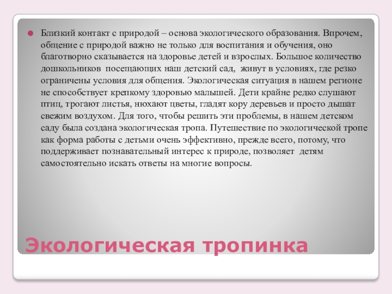 с природой важно не только для воспитания и обучения, оно благотворно сказывается на здоровье детей и взрослых. Большое количество дошкольников посещающих наш детский сад, живут в условиях, где резко ограничены условия для общения. Экологическая ситуация в нашем регионе не способствует крепкому здоровью малышей. Дети крайне редко слушают птиц, трогают листья, нюхают цветы, гладят кору деревьев и просто дышат свежим воздухом. Для того, чтобы решить эти проблемы, в нашем детском саду была создана экологическая тропа. Путешествие по экологической тропе как форма работы с детьми очень эффективно, прежде всего, потому, что поддерживает познавательный интерес к природе, позволяет детям самостоятельно искать ответы на многие вопросы.
