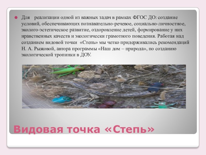 ФГОС ДО: создание условий, обеспечивающих познавательно-речевое, социально-личностное, эколого-эстетическое развитие, оздоровление детей, формирование у них нравственных качеств и экологически грамотного поведения. Работая над созданием видовой точки «Степь» мы четко придерживались рекомендаций Н. А. Рыжовой, автора программы «Наш дом – природа», по созданию экологической тропинки в ДОУ.