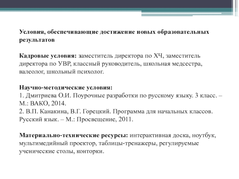 Материально-технические ресурсы: интерактивная доска, ноутбук, мультимедийный проектор, таблицы-тренажеры, регулируемые ученические столы, конторки.