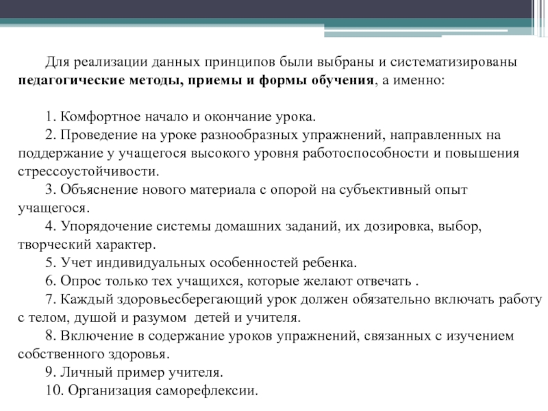 Слайд 9Для реализации данных принципов были выбраны и систематизированы педагогические методы, приемы