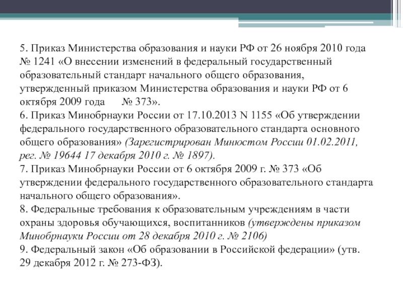 6. Приказ Минобрнауки России от 17.10.2013 N 1155 «Об утверждении федерального государственного образовательного стандарта основного общего образования» (Зарегистрирован Минюстом России 01.02.2011, рег. № 19644 17 декабря 2010 г. № 1897).