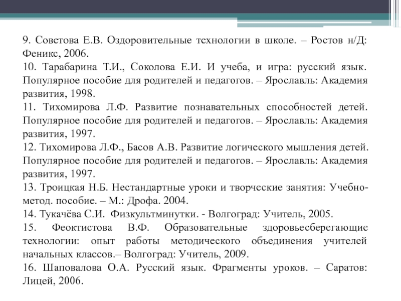 Слайд 169. Советова Е.В. Оздоровительные технологии в школе. – Ростов н/Д: Феникс,