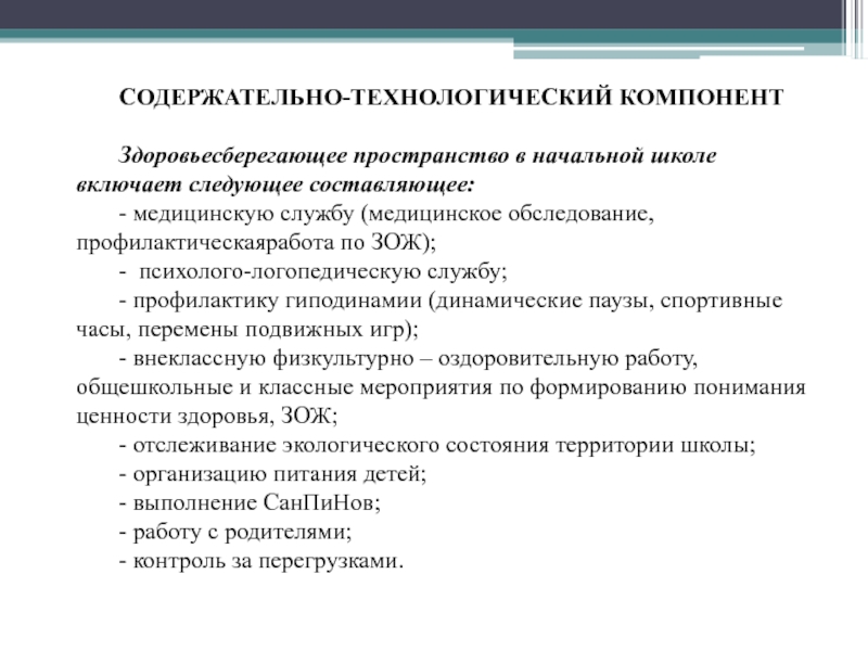 Здоровьесберегающее пространство в начальной школе включает следующее составляющее: