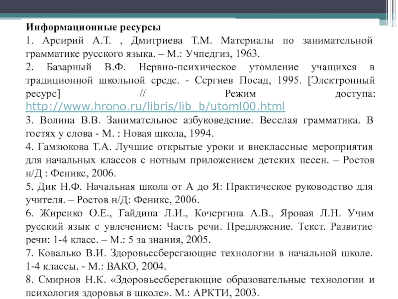 2. Базарный В.Ф. Нервно-психическое утомление учащихся в традиционной школьной среде. - Сергиев Посад, 1995. [Электронный ресурс] // Режим доступа: http://www.hrono.ru/libris/lib_b/utoml00.html