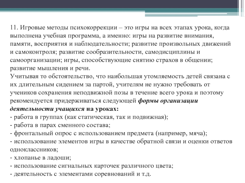 Слайд 1011. Игровые методы психокоррекции – это игры на всех этапах урока,
