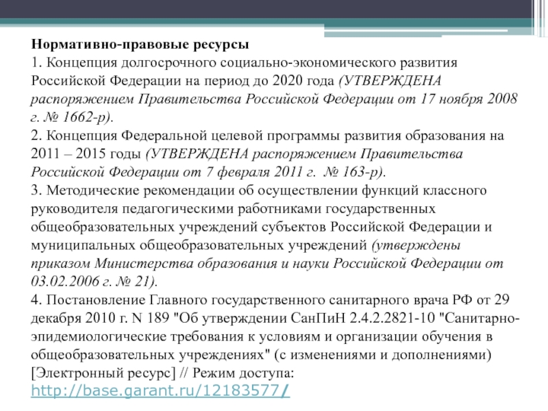 3. Методические рекомендации об осуществлении функций классного руководителя педагогическими работниками государственных общеобразовательных учреждений субъектов Российской Федерации и муниципальных общеобразовательных учреждений (утверждены приказом Министерства образования и науки Российской Федерации от 03.02.2006 г. № 21).