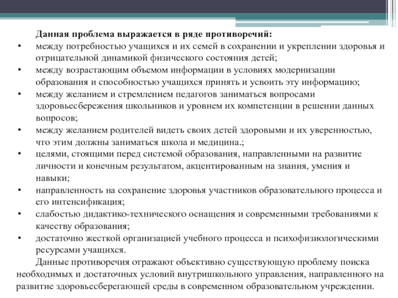 Данные противоречия отражают объективно существующую проблему поиска необходимых и достаточных условий внутришкольного управления, направленного на развитие здоровьесберегающей среды в современном образовательном учреждении.