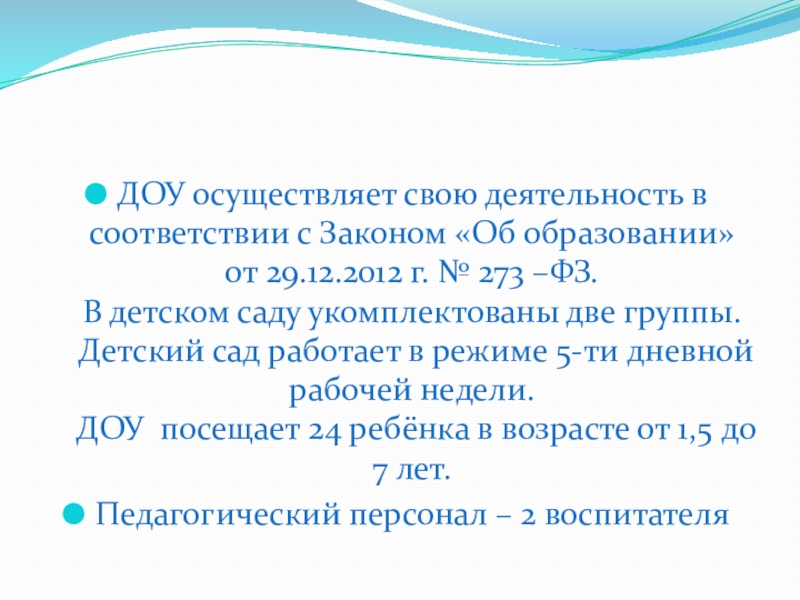 29.12.2012 г. № 273 –ФЗ. В детском саду укомплектованы две группы. Детский сад работает в режиме 5-ти дневной рабочей недели. ДОУ посещает 24 ребёнка в возрасте от 1,5 до 7 лет.